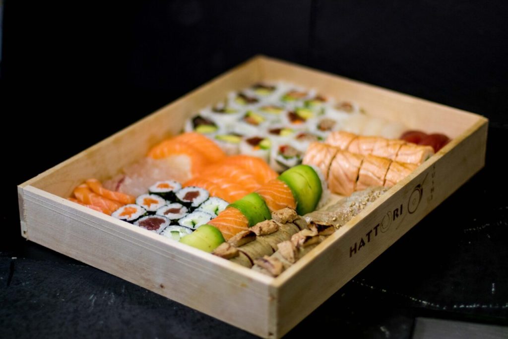 Triol box 50 pièces « 8 caterpillars, 8 salmon rolls, 8 rainbow rolls, 8 nigiris, 6 hosomakis et 6 futomakis ». 70,00 € -